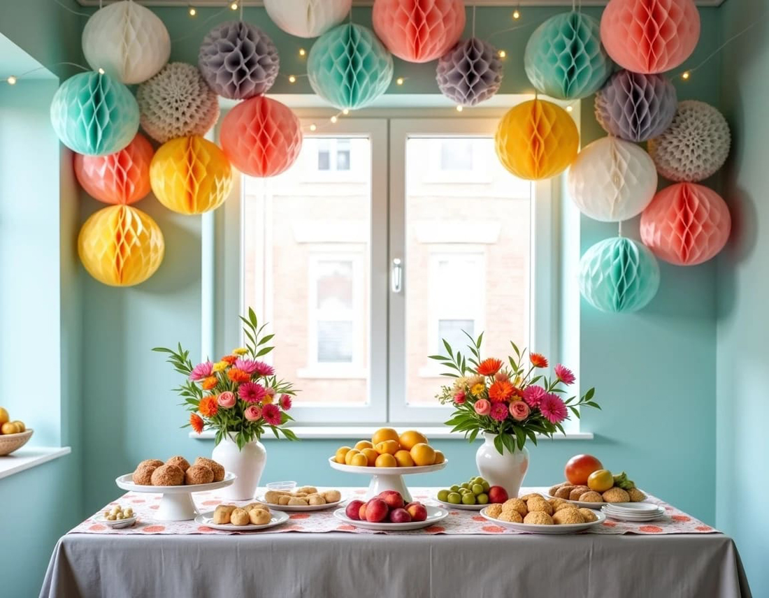2. Японский — оформление стен, люстр и дверей из гофрированной бумаги и фигурками оригами из гофрированной бумаги. Смотрится декор очень красиво, если правильно подобрать цветовую палитру и форму бумажных украшений: цветы, шары, помпоны, бахрома и т.д.